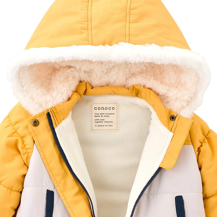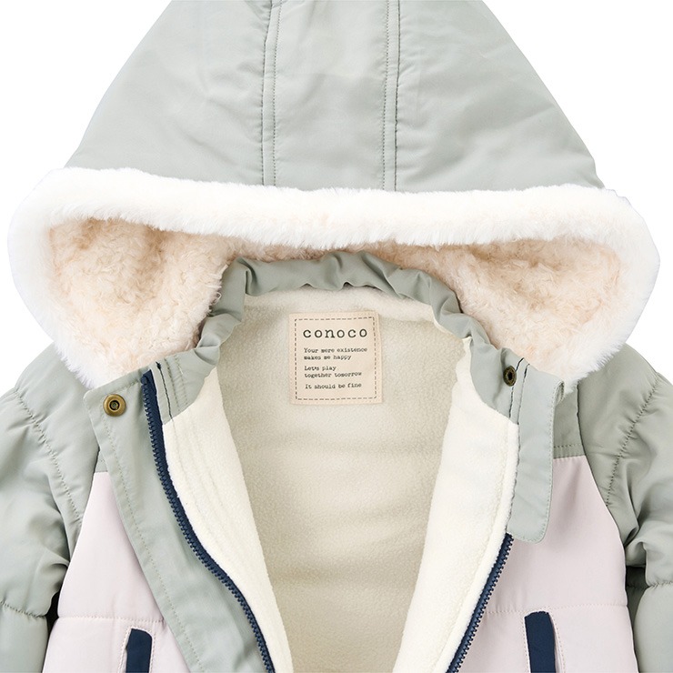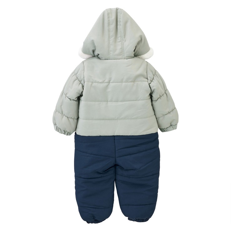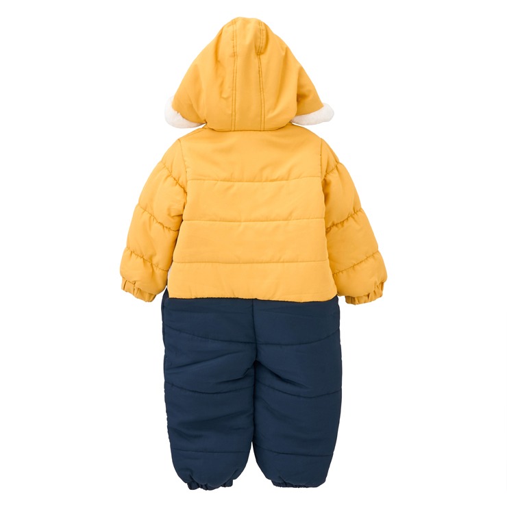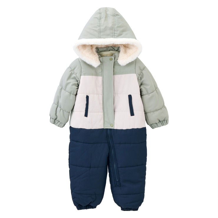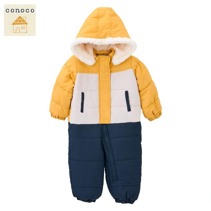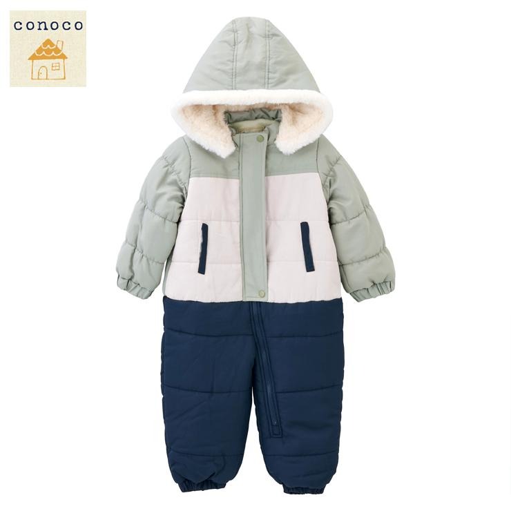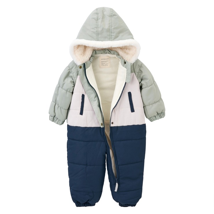 スタイリッシュな配色が目を引く、中綿入りのジャンプスーツです。ユニデザインでアクティブな印象に仕上がりました。全身を暖かく包み込み、寒い季節のアウトドアやお出かけに最適です。