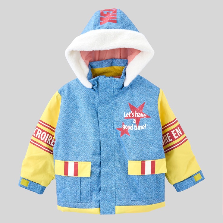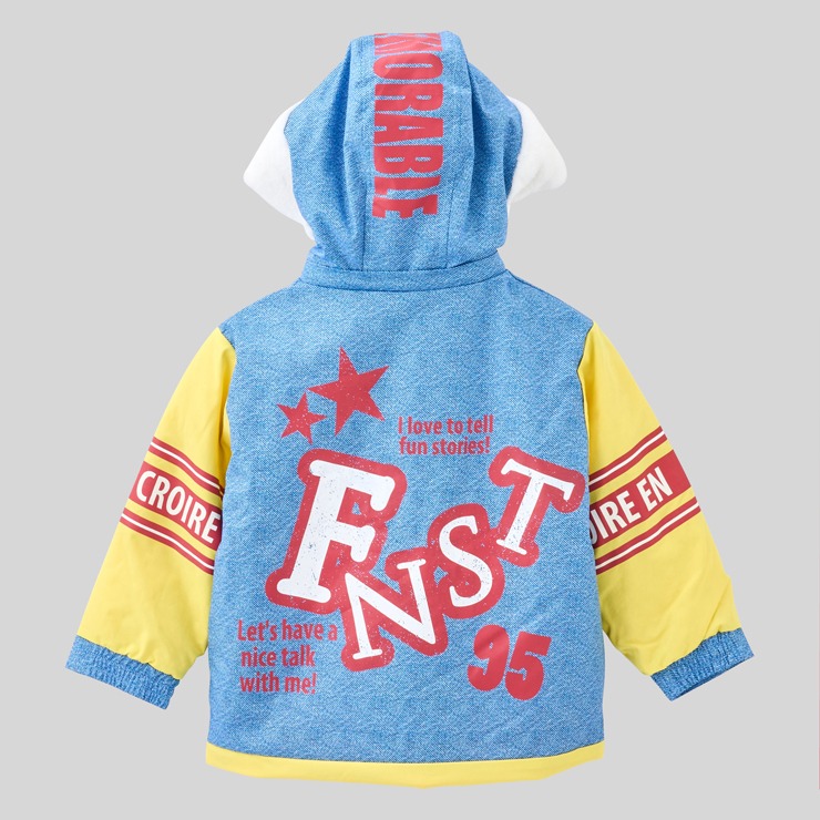 フードは取り外し可能で、袖口は面ゴムがついておりサイズ調整可能です。