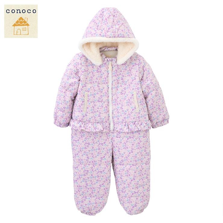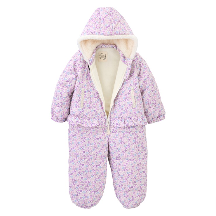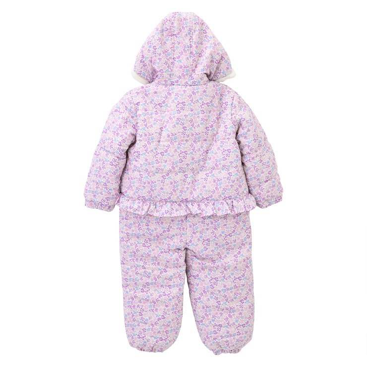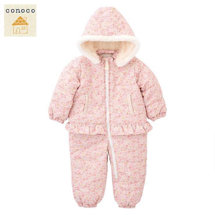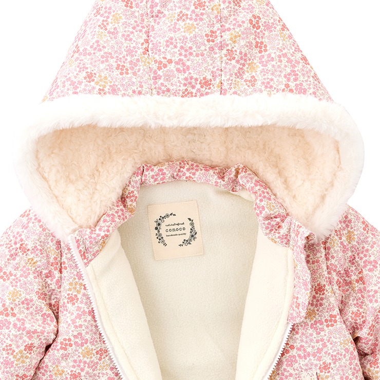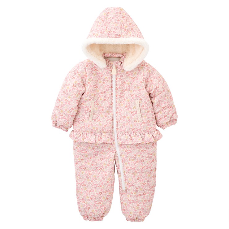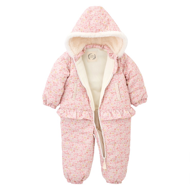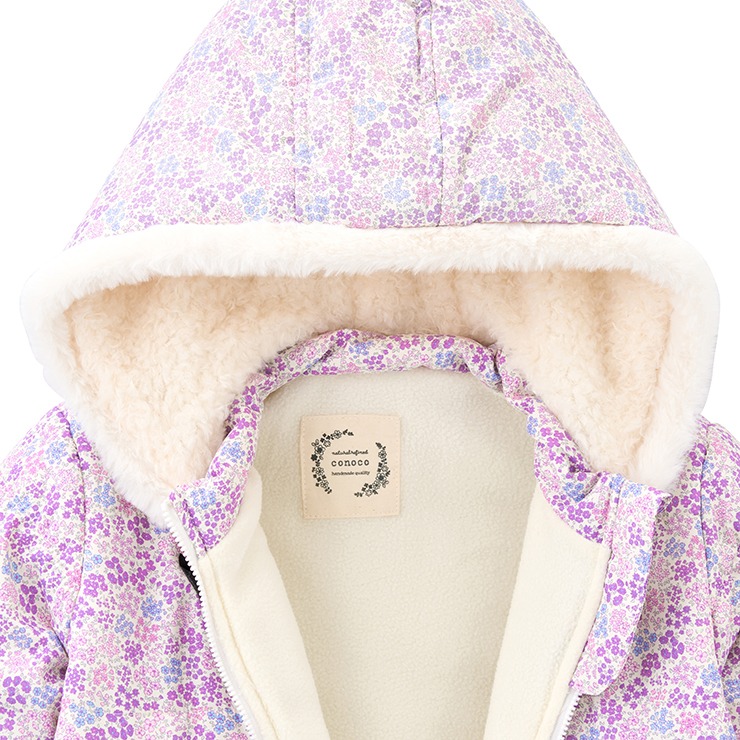 可憐な小花柄がちりばめられた、中綿入りのジャンプスーツです。フードのふわふわボアとウエストのフリルが、お子様の可愛らしさを引き立てます。全身を優しく包み込み、寒い日のお出かけも安心です。