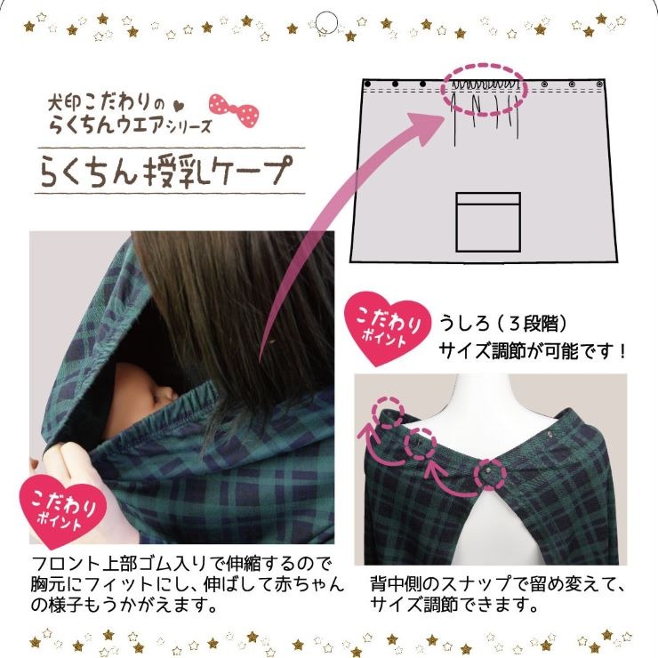 ・フロント上部ゴム入りで伸縮するので胸元にフィットし、伸ばして赤ちゃんの様子もうかがえます。
