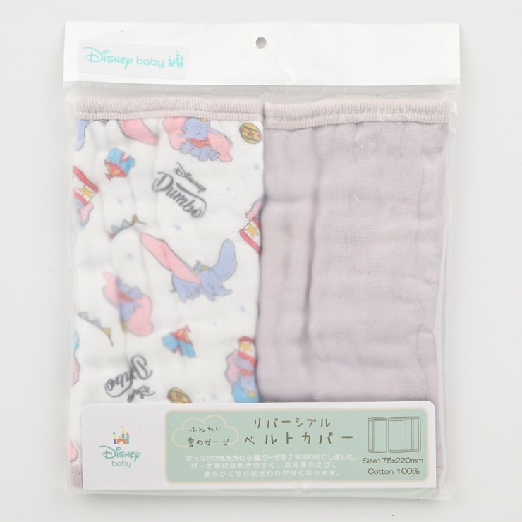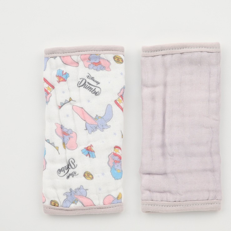 「ディズニー、ダンボ柄」のベルトカバーです。 たっぷり空気を含む6層ガーゼを2枚合わせにしました。 ガーゼ素材は乾きやすく、お洗濯のたびに柔らかくなり肌ざわりが良くなります。