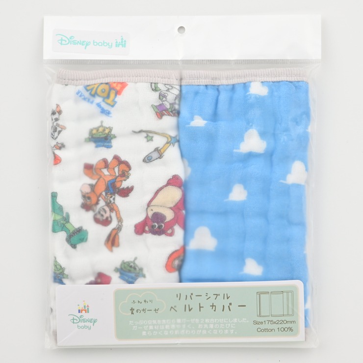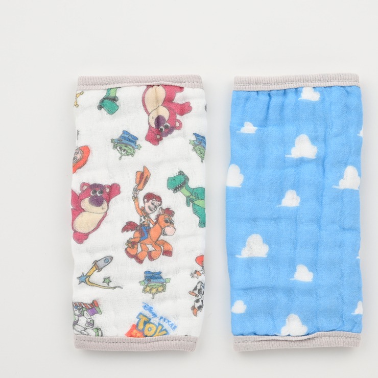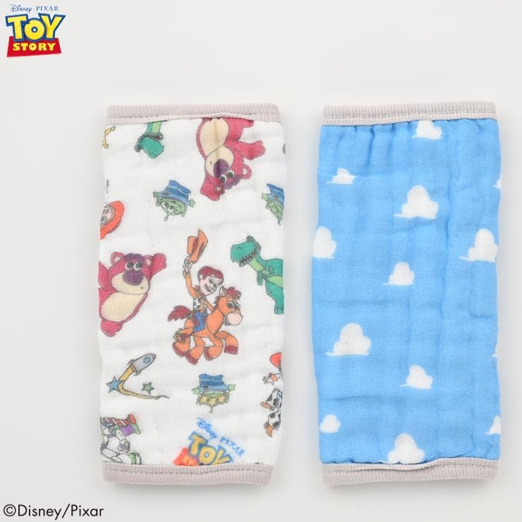 「ディズニー、トイストーリー柄」のベルトカバーです。 たっぷり空気を含む6層ガーゼを2枚合わせにしました。 ガーゼ素材は乾きやすく、お洗濯のたびに柔らかくなり肌ざわりが良くなります。