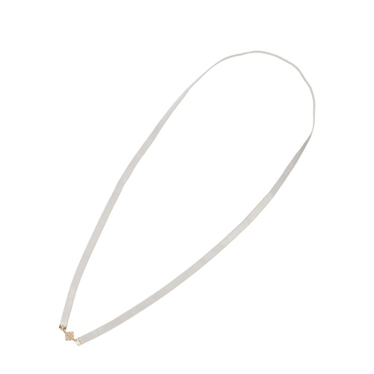 ②ストラップの端を、洋服の裾から引き出して首にかけます。