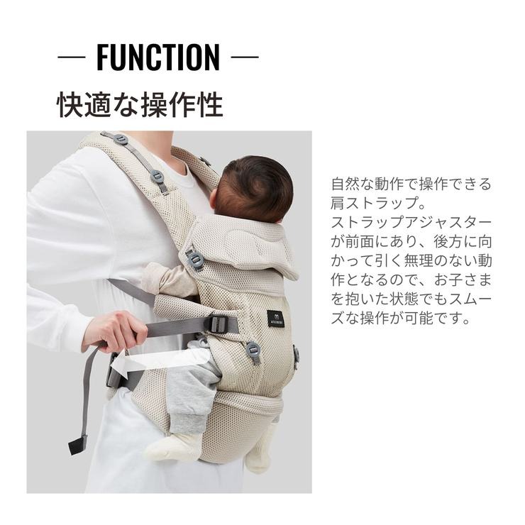 お子さまを下から支えるラクダキクッションを装備。柔らかさとしっかりとした形状を両立した発泡ウレタン製のクッションにより、ママパパの肩腰への負担を軽減させます。 また、よりラクにお子さまを抱き上げることができます。