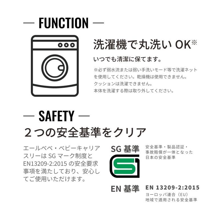 対面抱っこ:生後14日(体重3.2kg)~ 24ヶ月(体重13kg)※生後14-1ヶ月まではSGマーク制度の対象外です。