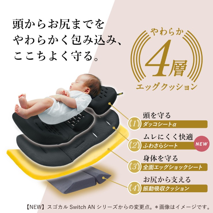 ●赤ちゃんの頭からお尻までをやわらかく包み込む「やわらか4層エッグクッション」。