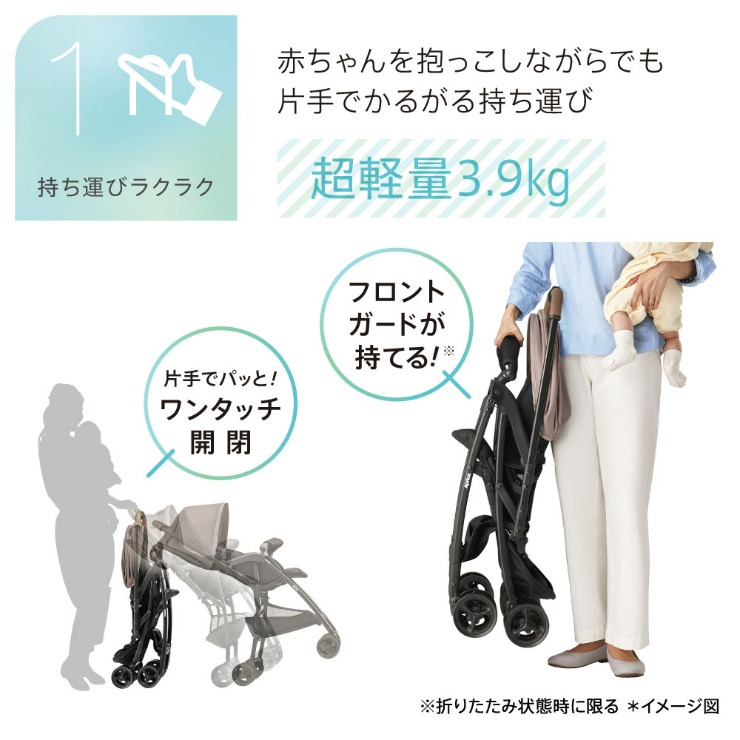 ●軽量3.9kgで持ち運びラクラク。片手でパッとワンタッチ開閉。折りたたんだ時にフロントガードが持てる。