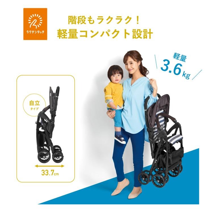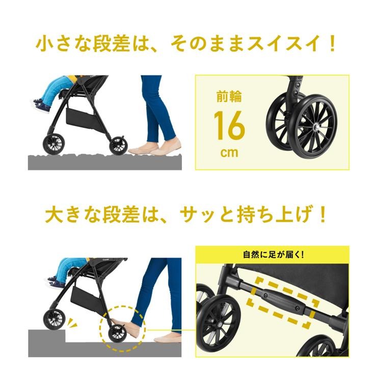 ●さらに、3.6kgの軽さに加え、段差もサッと越えられるように「16cmの大型タイヤ(前輪)」「乗り越えステップ」を搭載した新発想のベビーカーです。