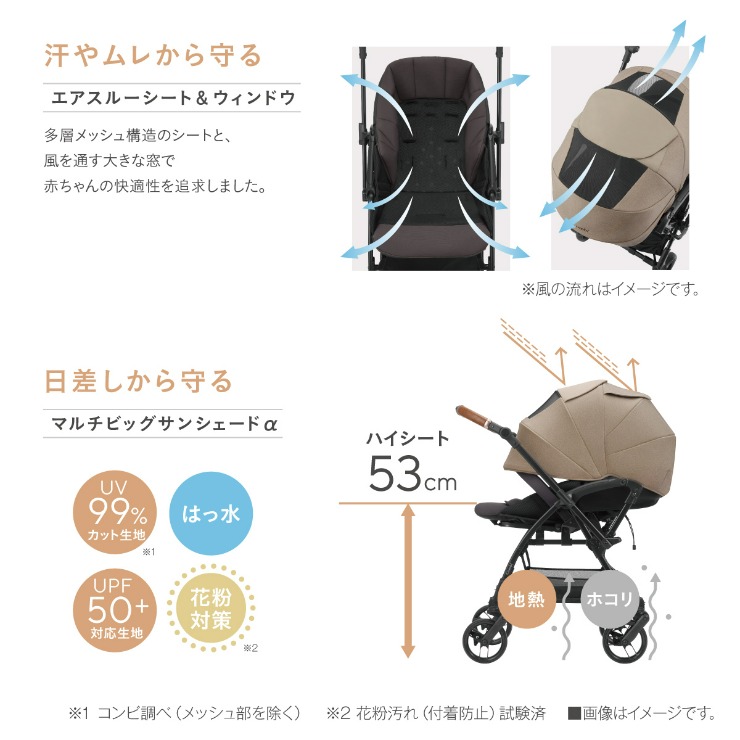 シートにメッシュ素材を採用し、体温調節が苦手な赤ちゃんに快適な空間をつくります。