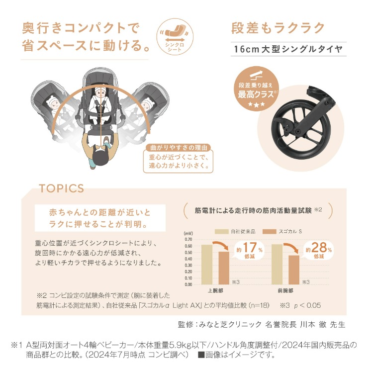 対面・背面のハンドル切り替えに連動し、進行方向に対して、前輪のキャスター(軸部)だけが自動で回転。小回りがきいて、行きたい方向にスムーズに移動できます。