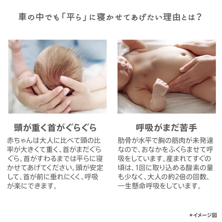 新生児から1歳頃までは 「平ら」なベッド、2歳頃まで 後向きシートで発達し始める頃に合わせ足が自由に動かせる姿勢に、