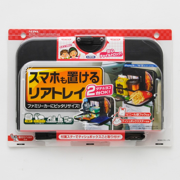 スマートフォンを縦置きと横置きでそれぞれ収納できるポケットが付いたリアトレイです。