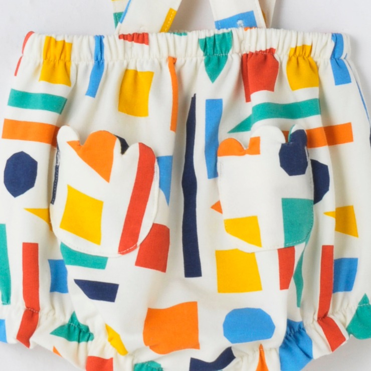 カラフルでポップな総柄デザインにチューリップの形のポケット使いがかわいいです。