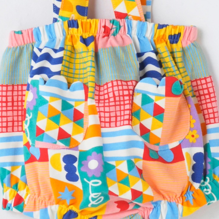 カラフルでポップな総柄デザインにチューリップの形のポケット使いがかわいいです。