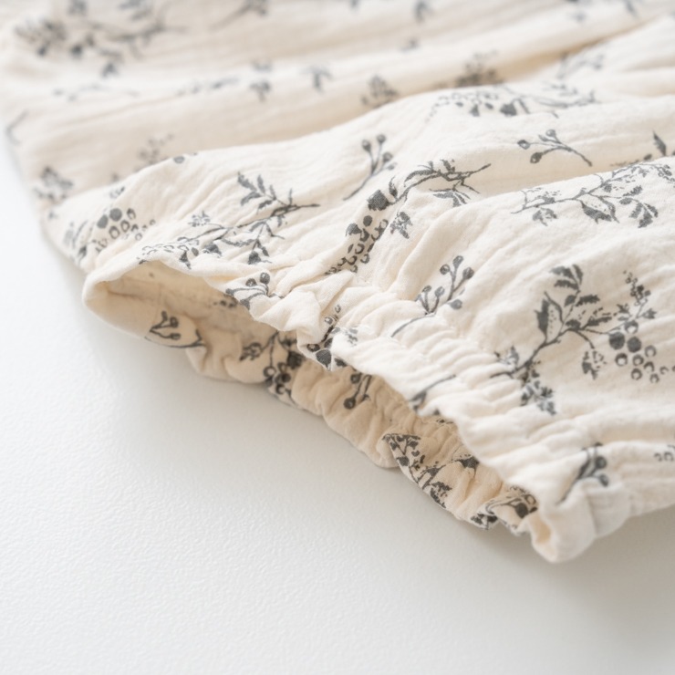 雰囲気のあるワッシャー加工のやさしい素材感に総柄プリントのかわいらしいデザインになっています。