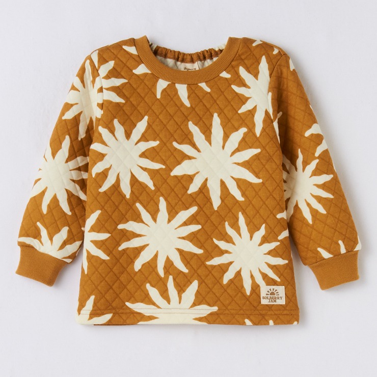 ナチュラルなブラウンカラーに太陽の総柄プリントがおしゃれです。