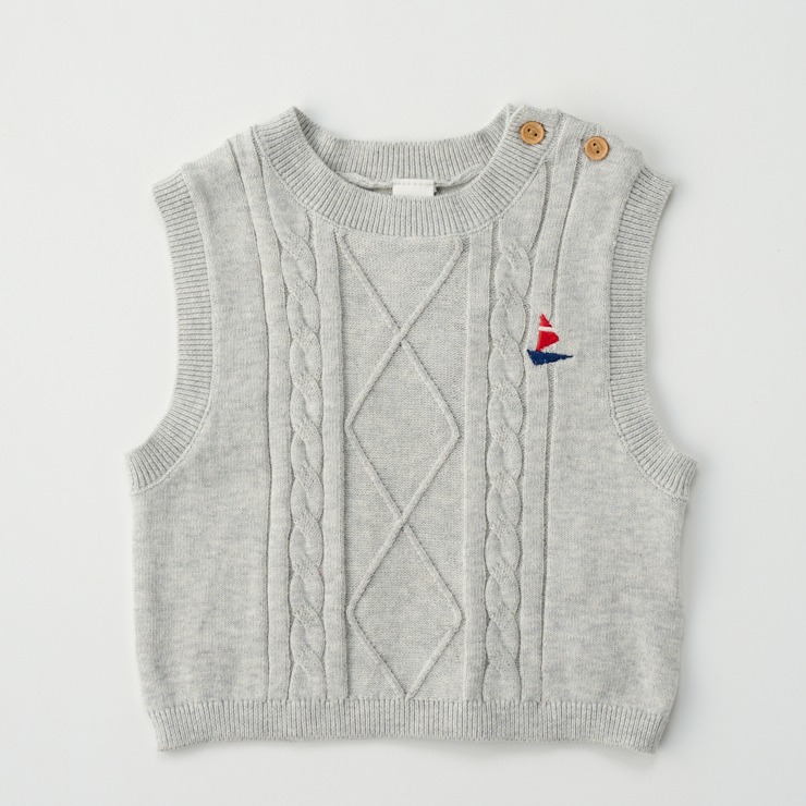 ケーブル編みにボタンと刺しゅうがアクセントになったベストです。