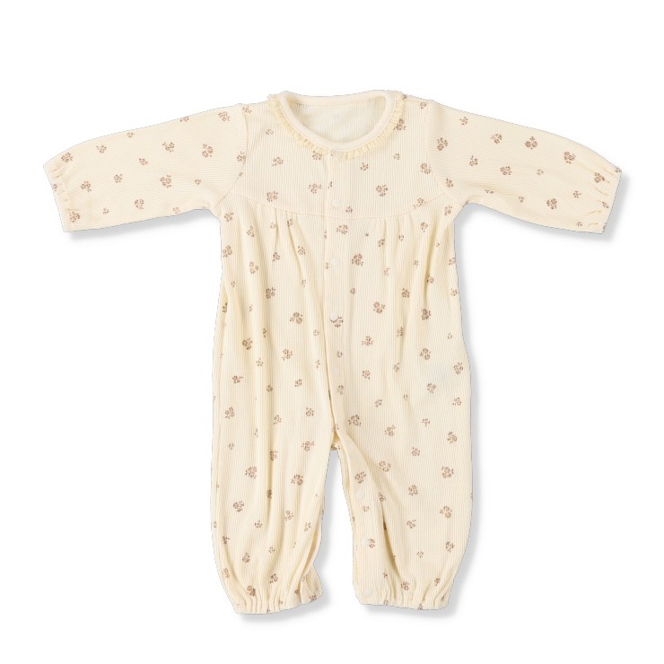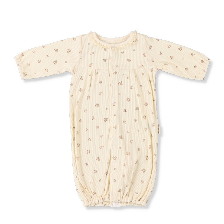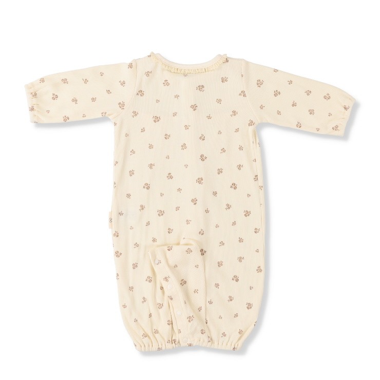ちいさな花柄が愛らしい兼用ドレス。柔らかなテレコ素材で、デリケートな赤ちゃんの肌に優しくフィットします。足元はドレス型とカバーオール型の2WAYで、成長に合わせて長く使えるのが魅力。新生児からのおしゃれを優しく彩ります。