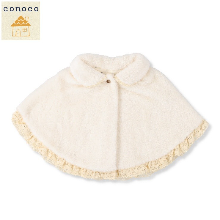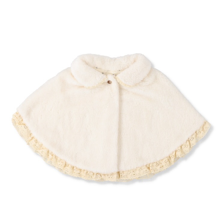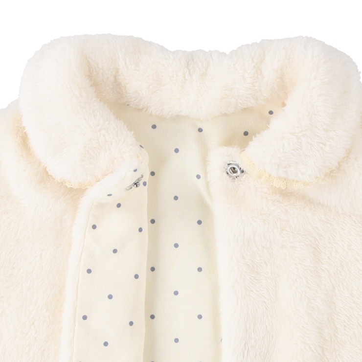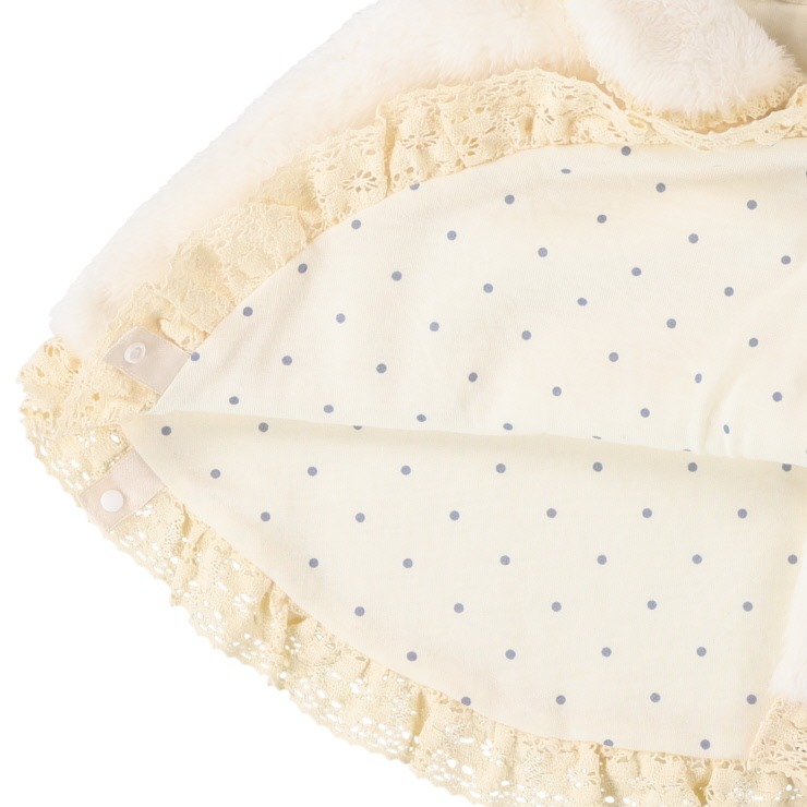 雪のようにふわふわとした愛らしいボアポンチョ。デリケートな赤ちゃんを優しく暖かく包み込みます。裏地の水玉プリントをチラ見せしても可愛いデザイン。おでかけやベビーカーでのお散歩に、さっと羽織れて、秋冬の装いを華やかに彩ります。