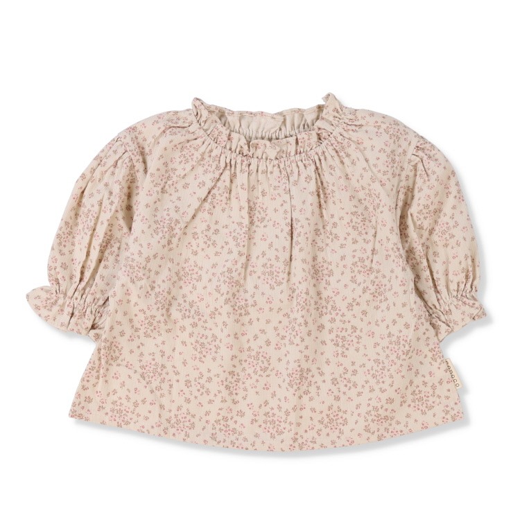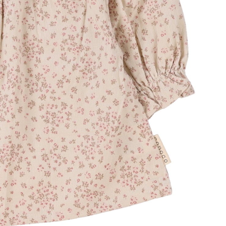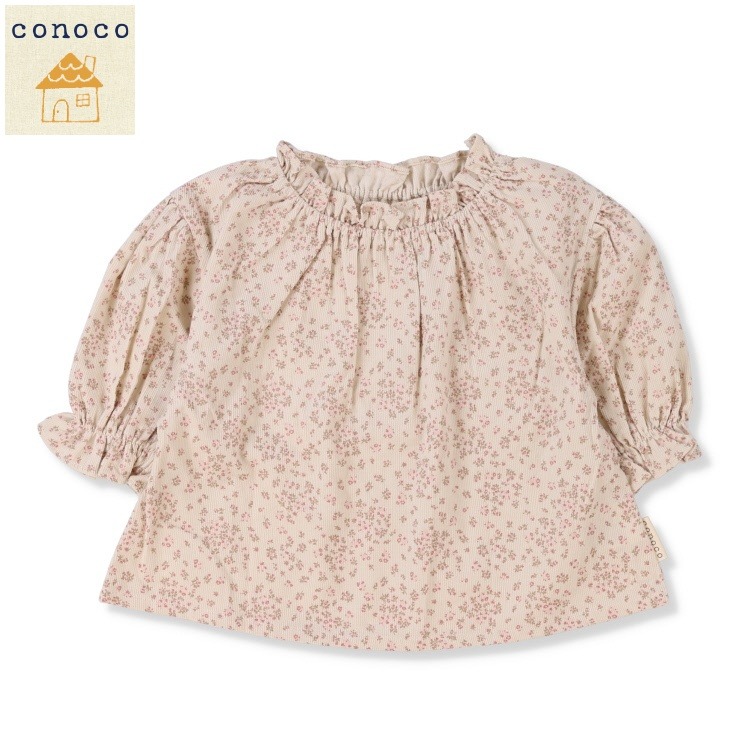 温かみのある小花柄コーデュロイ素材のスモッグブラウス。衿と袖口はゴム仕様で、お着替えもらくちんです。ふんわりとしたシルエットが愛らしく、肌触りも良く快適。デニムやシンプルなボトムスと合わせるだけで、可愛らしくお洒落なコーディネートが完成します。秋冬のデイリーユースにぴったりの一着です。