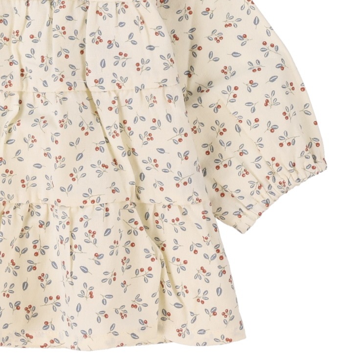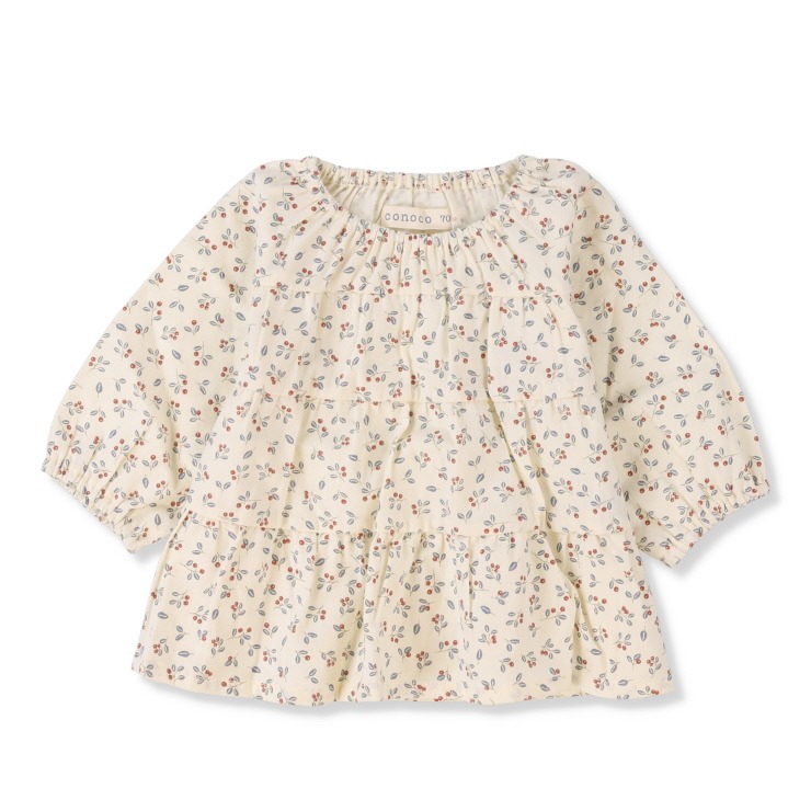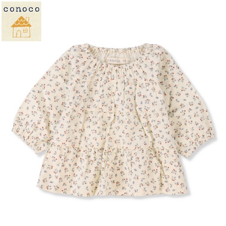 可愛い木の実柄のシャンブレー素材を使用したスモッグブラウス。ふんわり広がるティアードデザインが愛らしく、襟と袖口はゴム仕様でお着替えもスムーズです。ソフトな風合いで快適な着心地。一枚で主役になる華やかさでお出かけ着にも最適です。秋冬のコーディネートを彩る一着です。