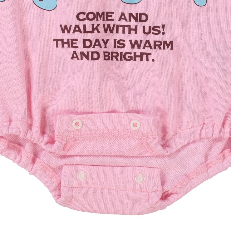 肩と股下にはスナップボタン付きで、着替えやおむつ替えもらくらくの1枚です。