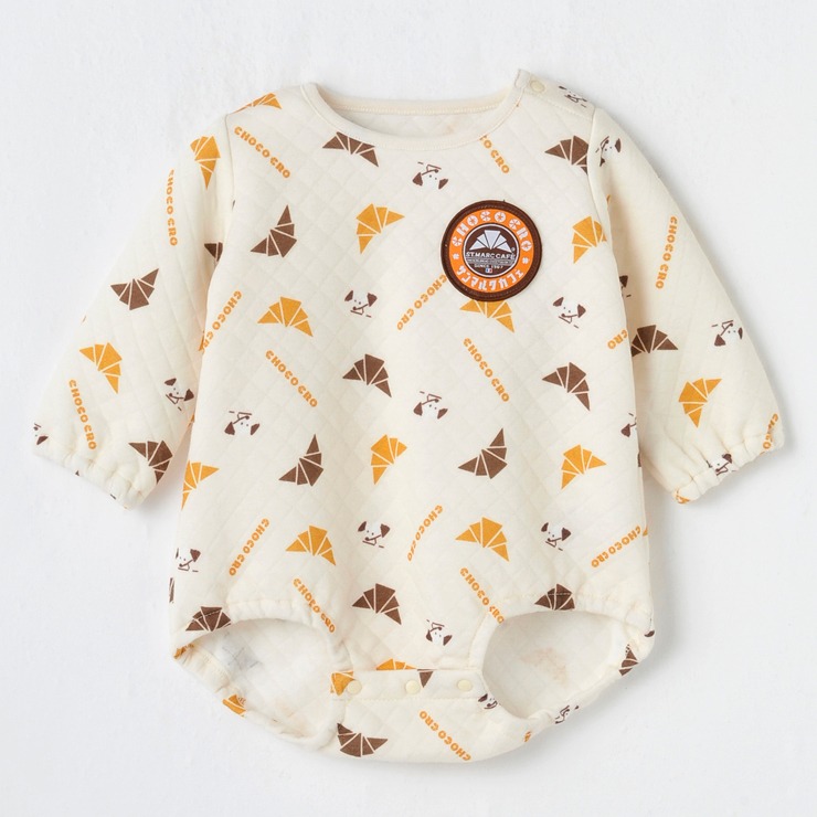 チョコクロとチョコクロ犬の総柄プリントがかわいいロンパースです。