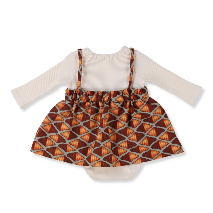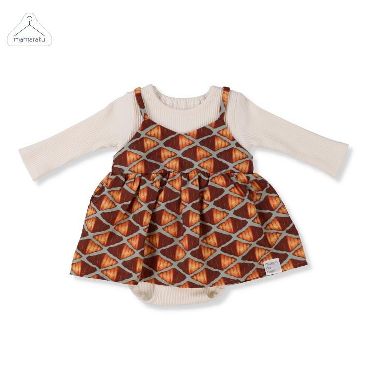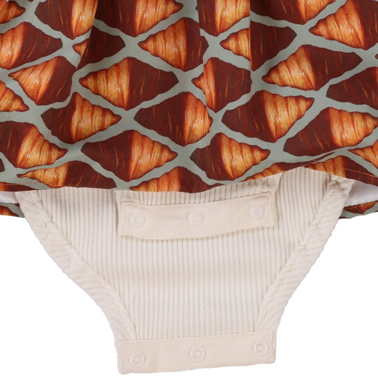 おいしそうなクロワッサンをプリントした重ね着風のロンパースです。