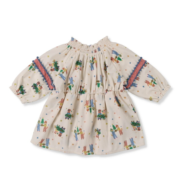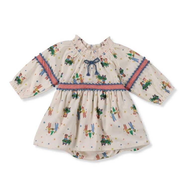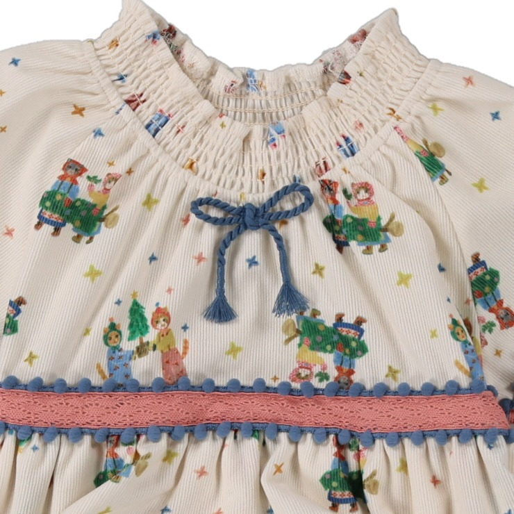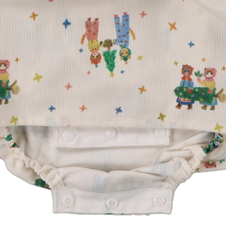 ツリーを運ぶ楽しそうな表情の猫のイラストが全体にプリントされたロンパースです。