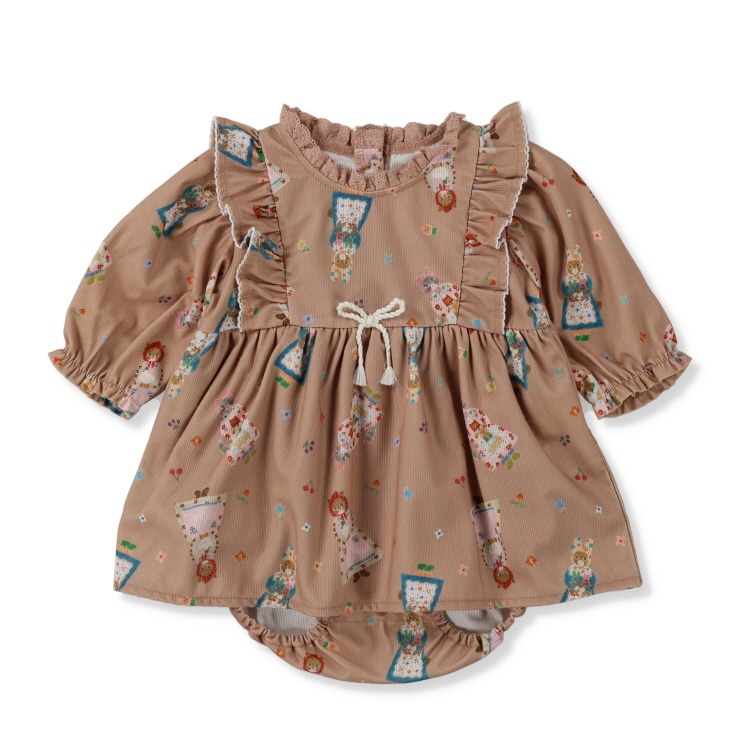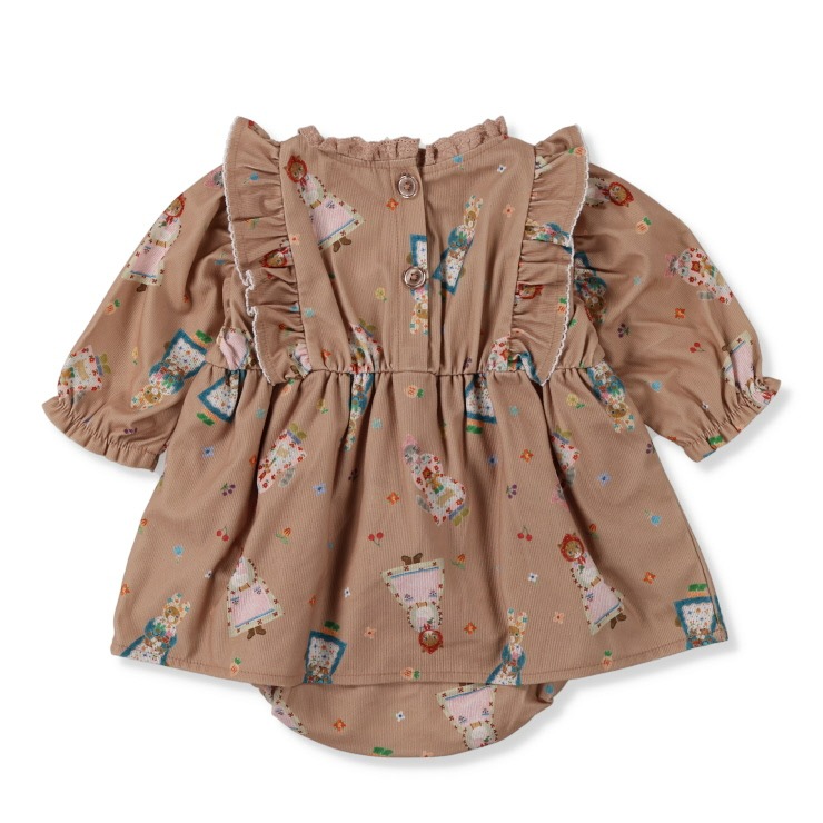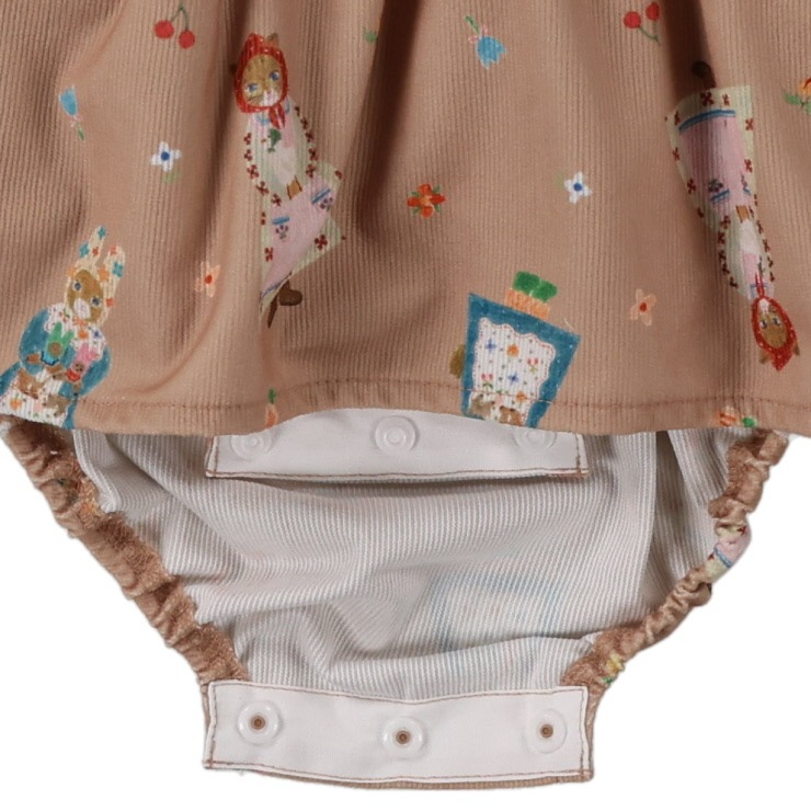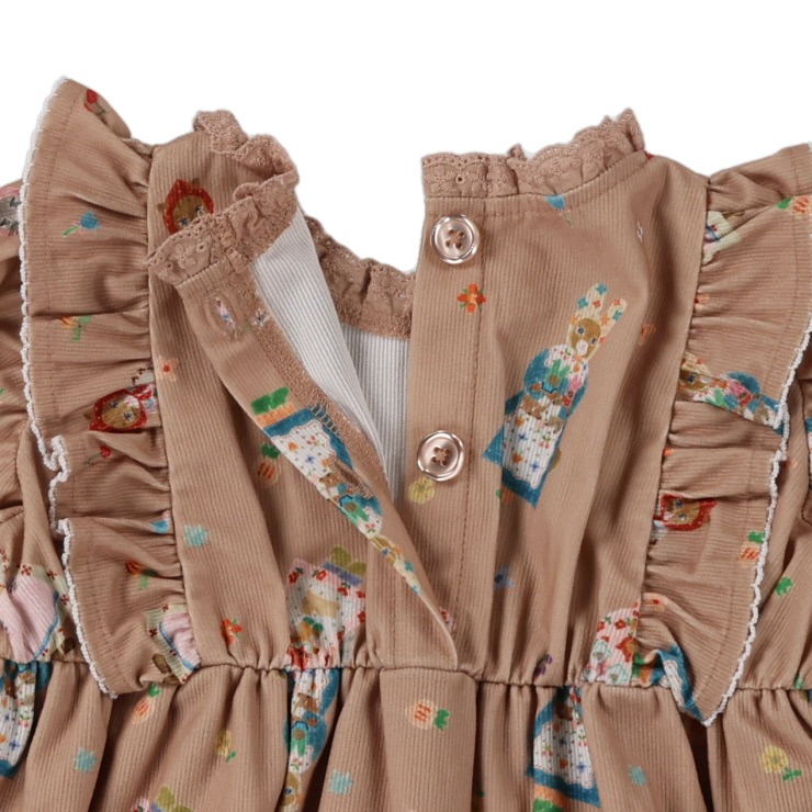 優しい表情の動物たちが全体にプリントされたロンパースです。