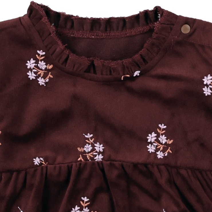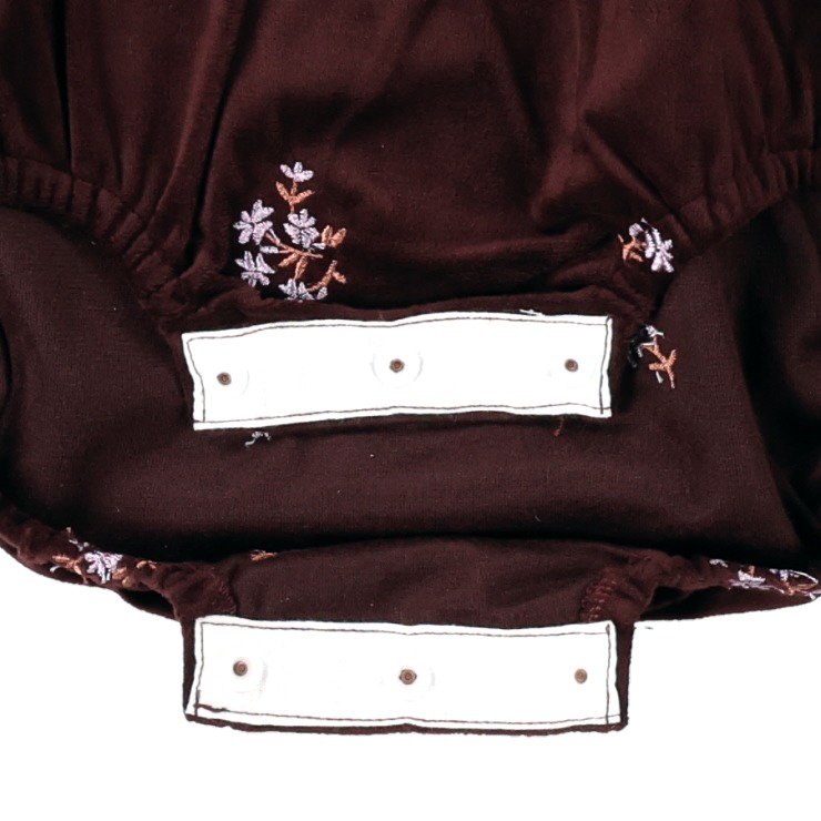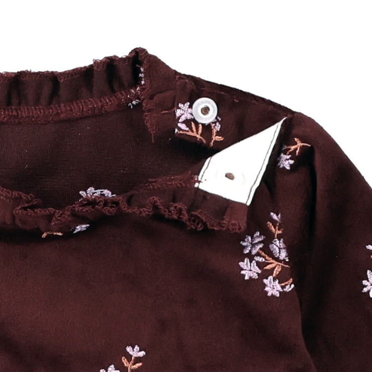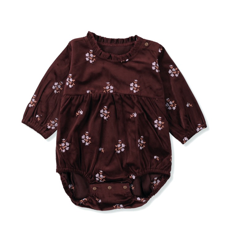 ベロア生地とお花の総柄刺繍がアンティーク調でかわいいロンパースです。