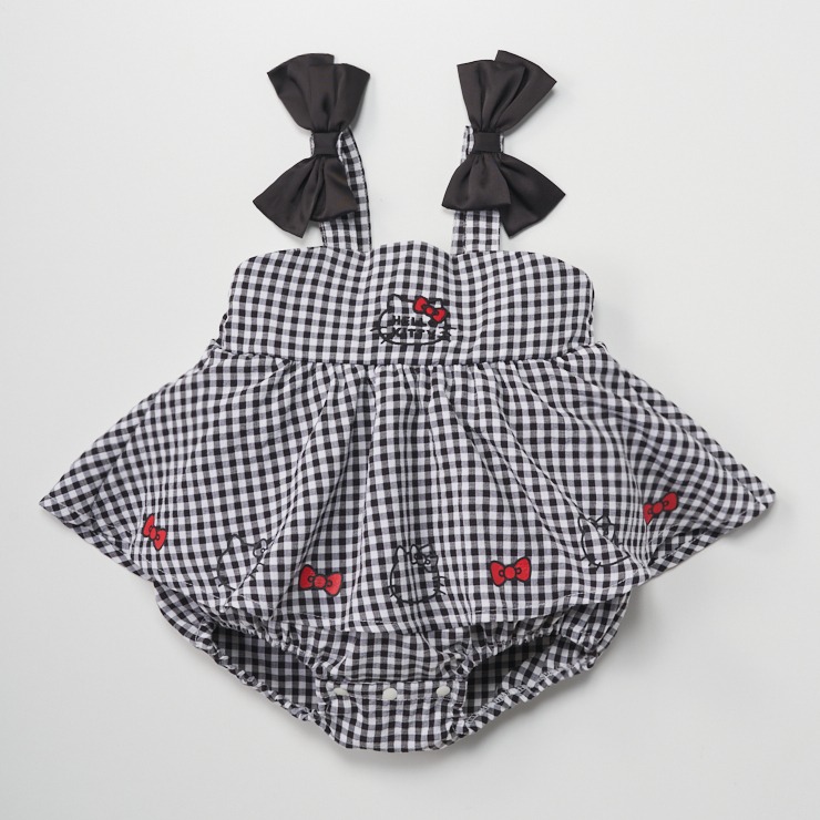 「ハローキティ」とリボンのプリント使い、胸当てにはいった「ハローキティ」の刺しゅう使いがかわいいです。