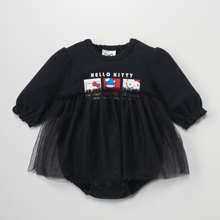 「ハローキティ」のプリントがかわいいインレイ素材のロンパスです。