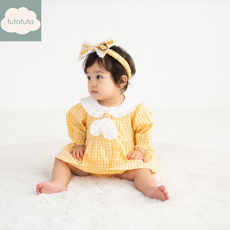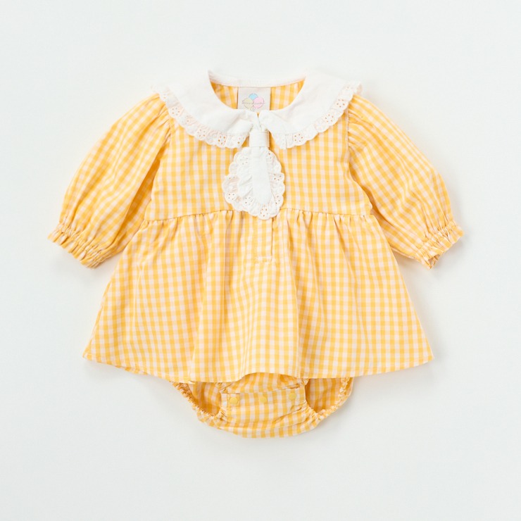 イエローのギンガムチェックにレースのフリルがついたセーラー衿のガーリーなデザインになっています。。