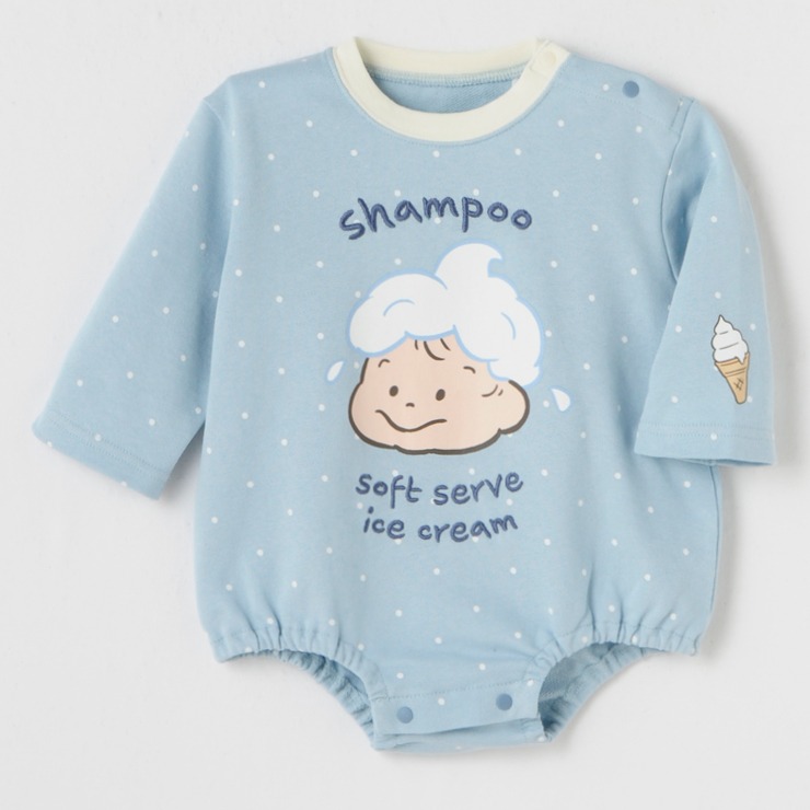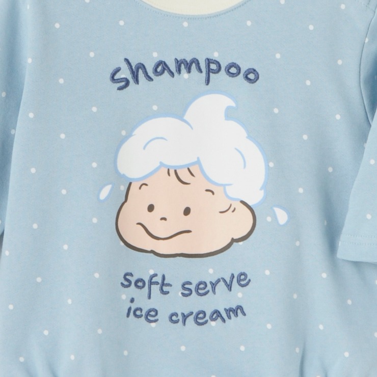 くすみブルー×ホワイトドットのやさしい配色に、左袖のソフトクリームプリントが可愛らしいアクセントに☆
