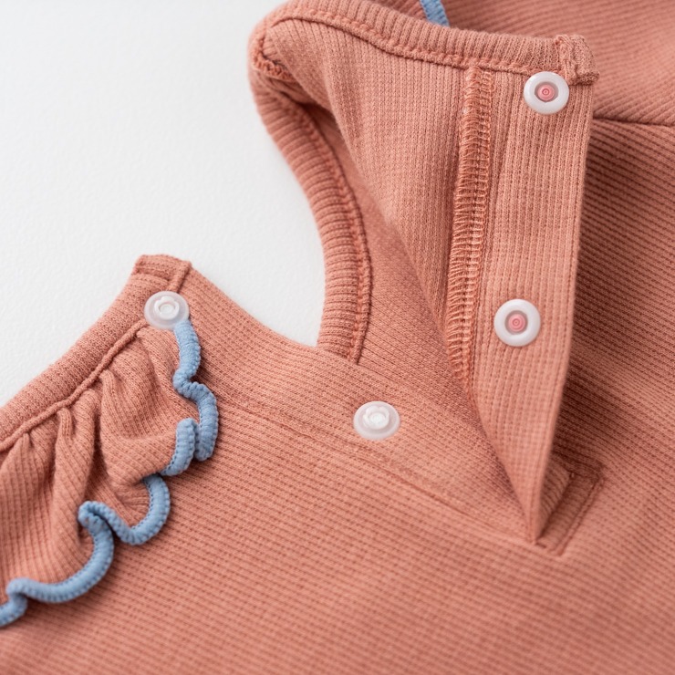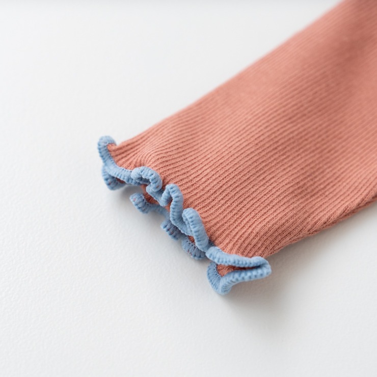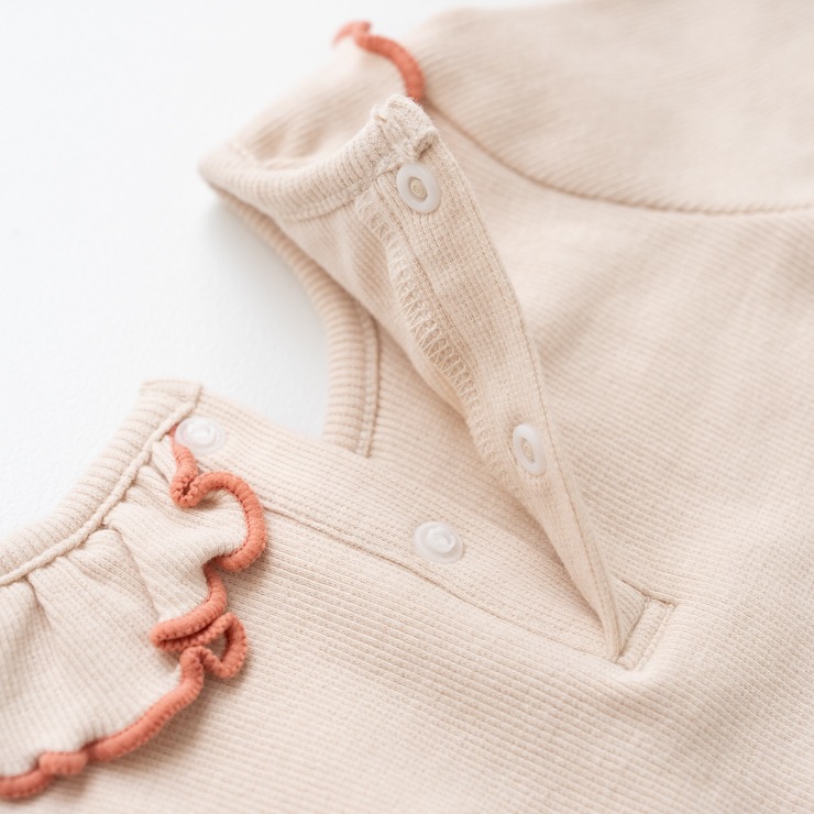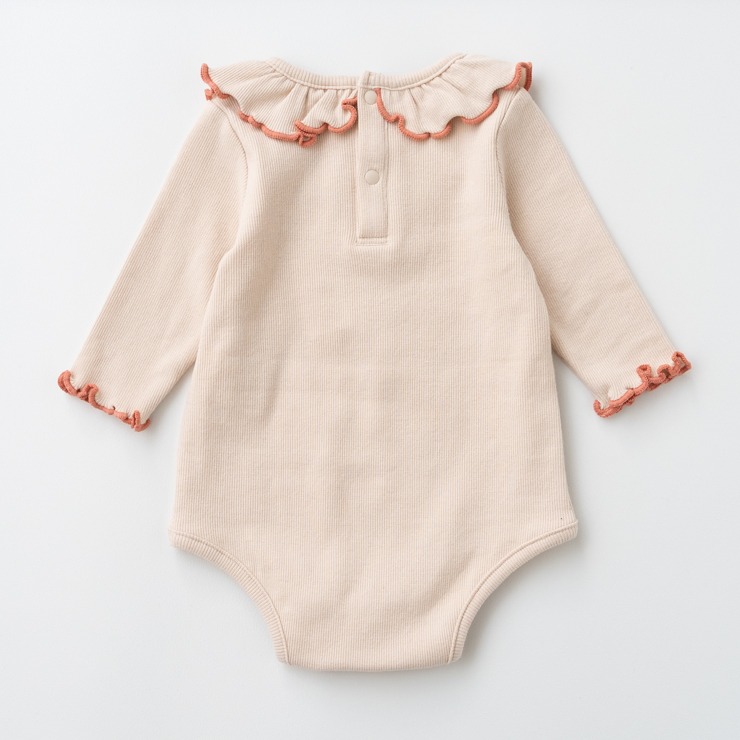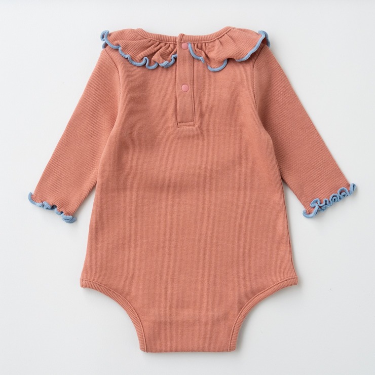 フリル衿のメロウ刺しゅうやチケット使いがアクセントになっています。