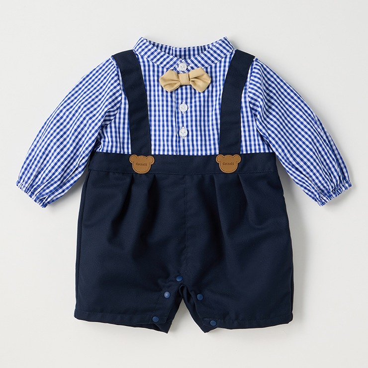 くまさんのワッペンがついたサスペンダーや蝶ネクタイがかわいいアクセントになっています。