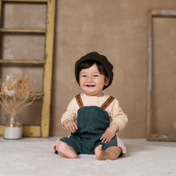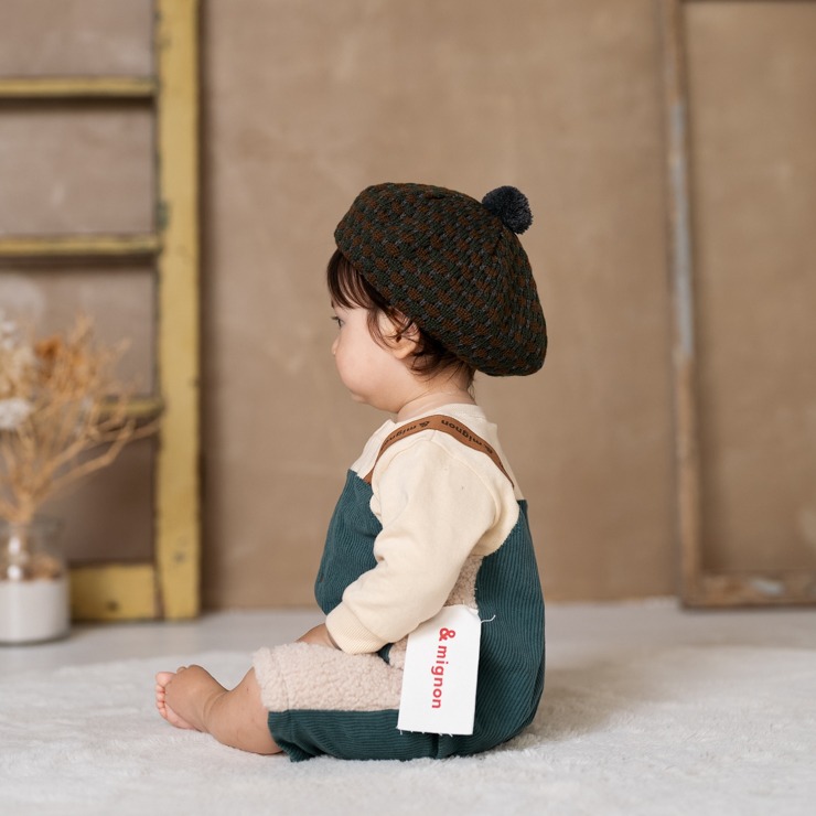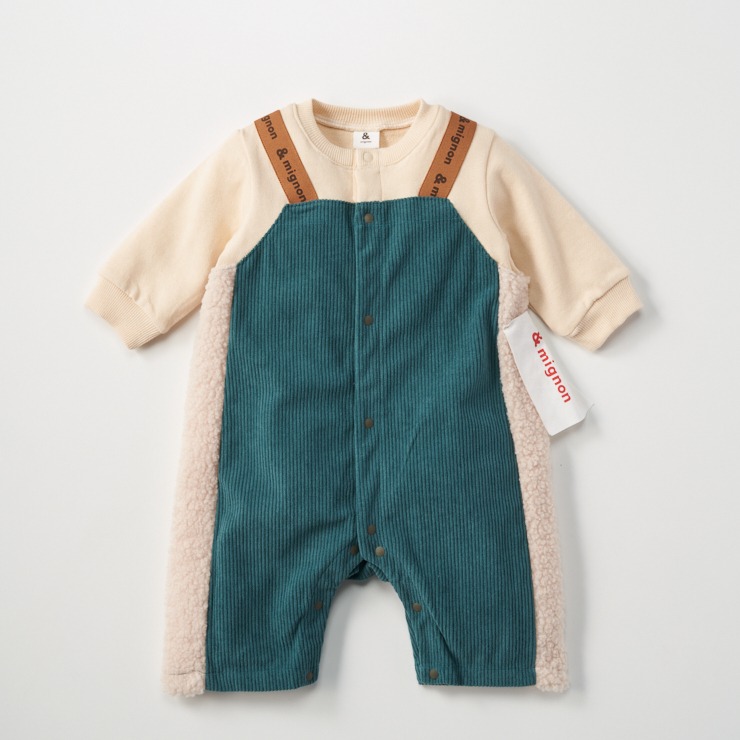コーデュロイ素材のサロペットにサイドがボアの切替になっています。