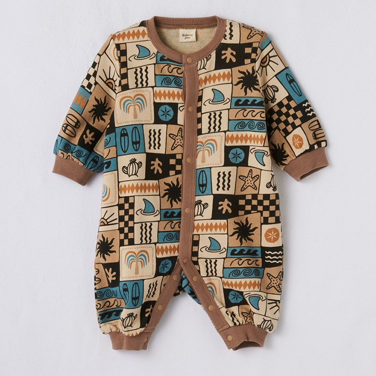 ブラウンカラーを中心にサーフなモチーフを使った総柄プリントがおしゃれです。