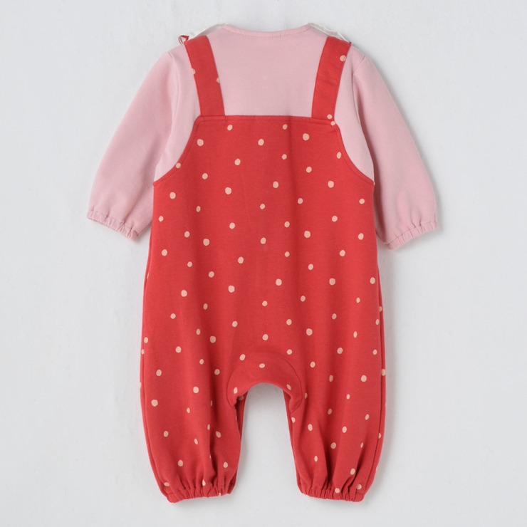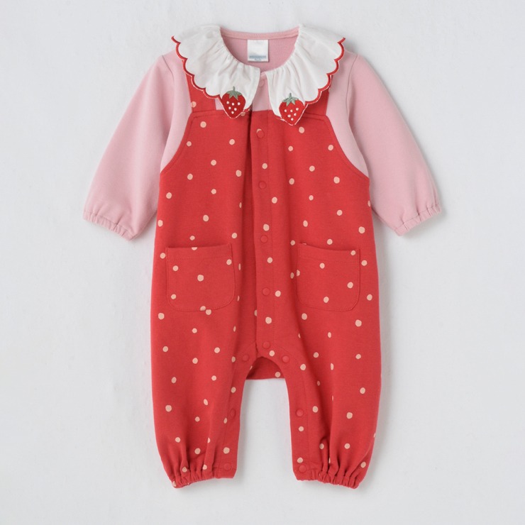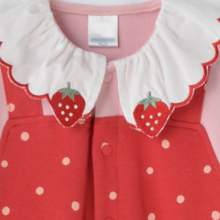 ドット柄のサロペットに衿にはいったいちごの刺しゅうがアクセントになっています。