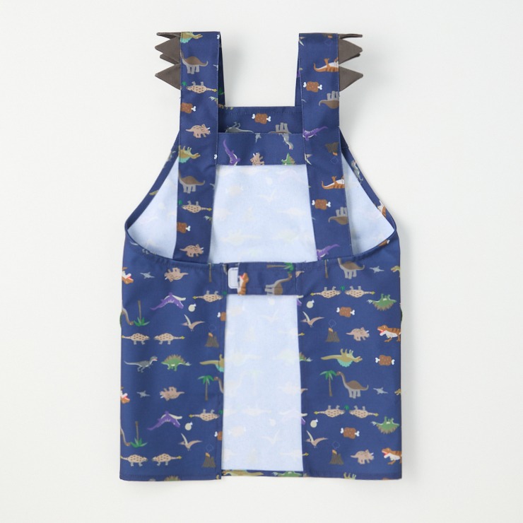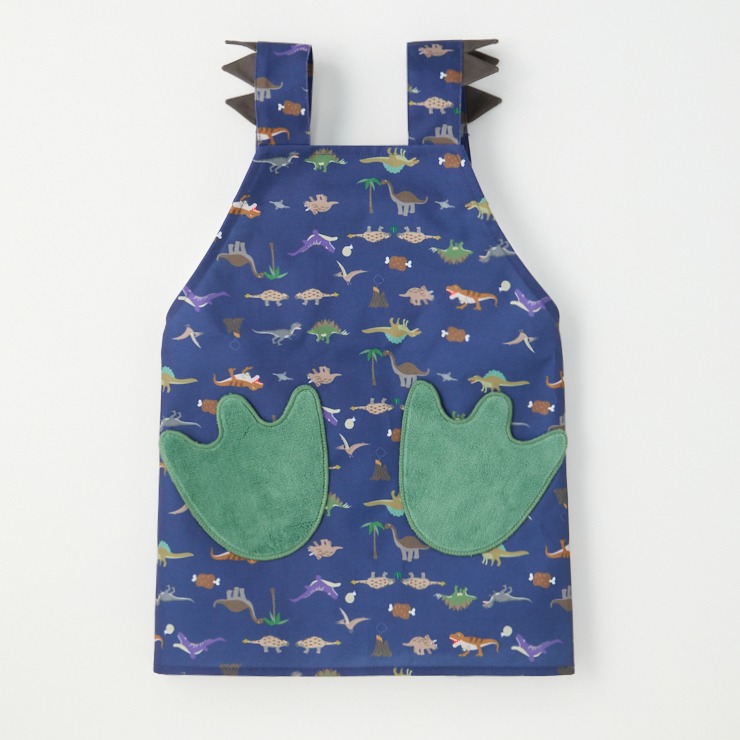 スピノサウルスは獲物のオンコプリスティスを追いかけている。ティラノサウルスとトリケラトプスが向き合っている!? ステゴサウルスとアロサウルスも向き合っている!? アンキロサウルスは大好きな草を食べ、ブラキオサウルスは葉っぱを食べ、モササウルスはアンモナイトを追いかけている( ^)o(^ )  そんなファンタジーな総柄エプロンで、好きな恐竜がどこにいるか探してみよう(^^)/ 肩ひも部分のトゲトゲや、ポケット部分がタオル生地で足形になっている事もかわいい( ^)o(^ )  本体には防汚加工を施してお手入れも楽ちんです!!