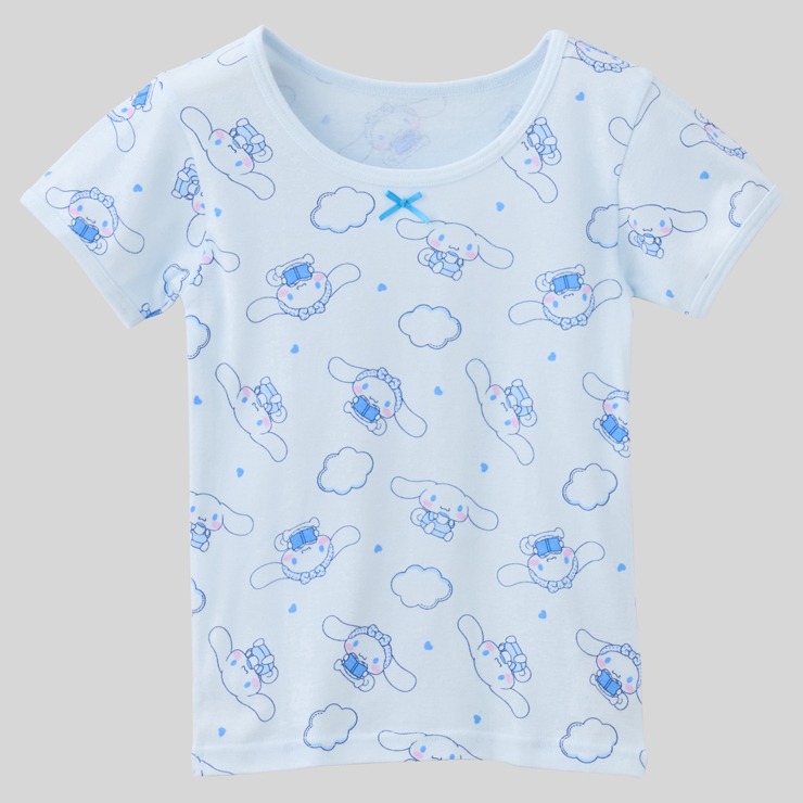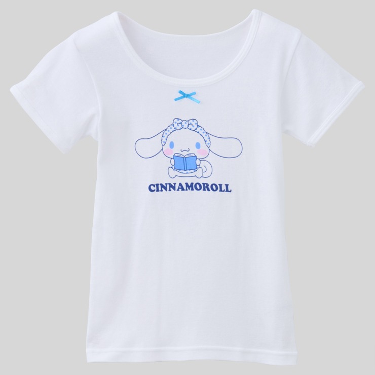 大人気 サンリオキャラクターズより シナモロール2枚組3分袖インナーが登場。 胸元にリボンが付き、かわいいシナモロールワンポイントプリントと総柄プリントの組合せ3分袖インナーです。