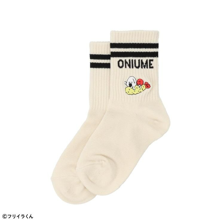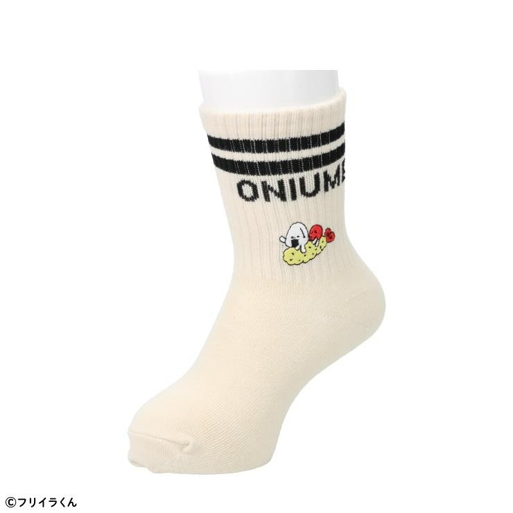 エビ天にのっているおにぎりとうめぼしの刺繍がサイドに付いたラインソックスです。