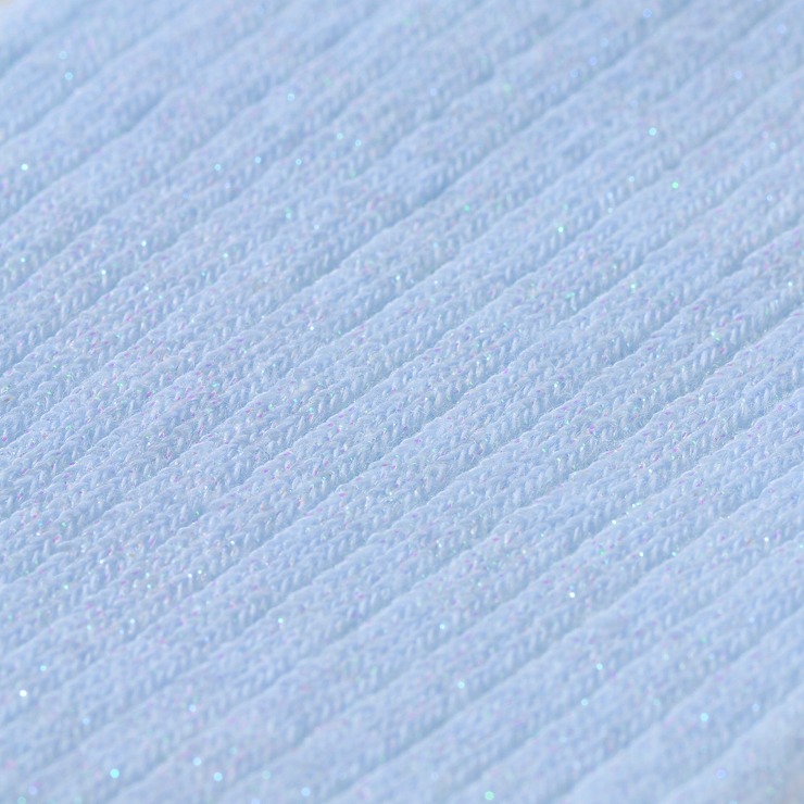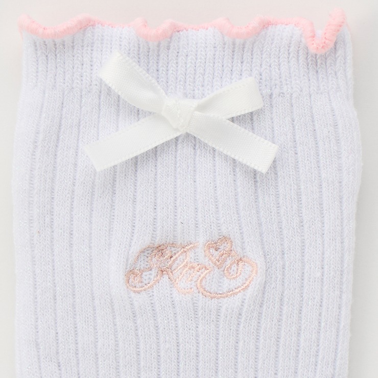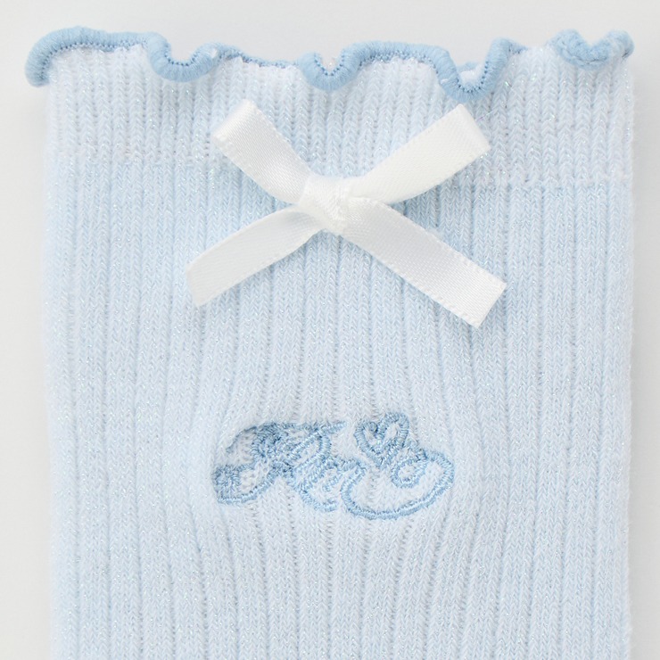 ラメのキラキラ、履き口のフリルメロウ、リボン、ロゴのししゅう…
