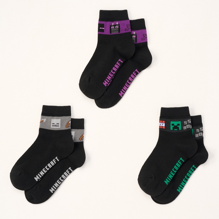 クリーパー、TNTの集合デザインに加え、スケルトンと弓、エンダーマンとエンダードラゴンがデザインされたショートソックス3枚組です♪
