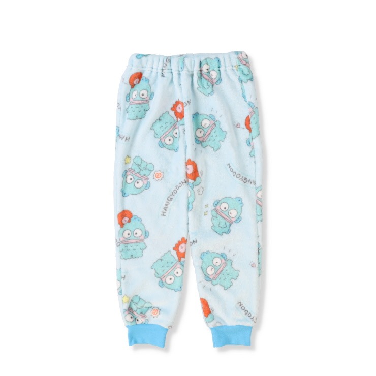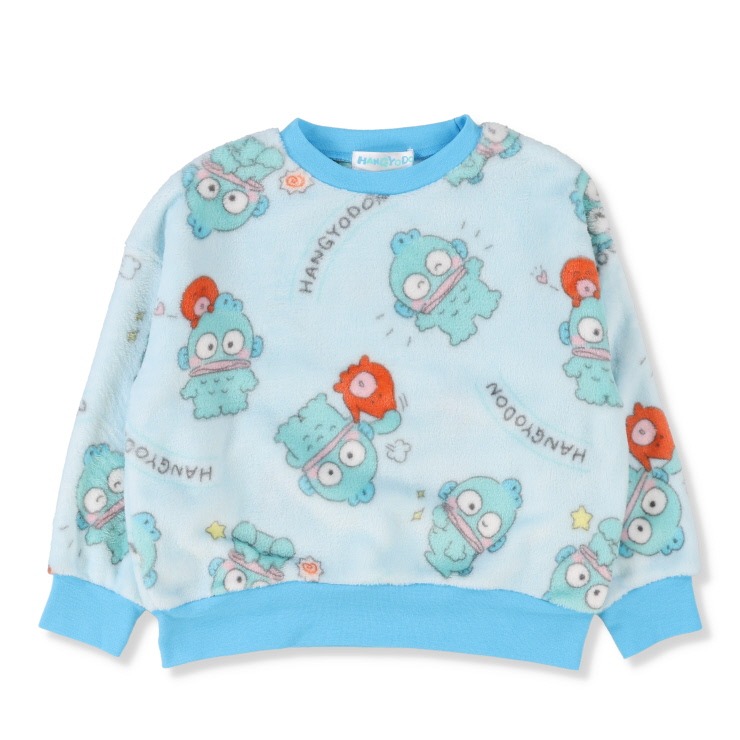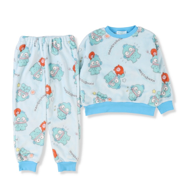 大人気 サンリオキャラクターズより ハンギョドン長袖パジャマが登場。 フリースあったか素材にハンギョドンの総柄プリントした上着と総柄ロングパンツです。