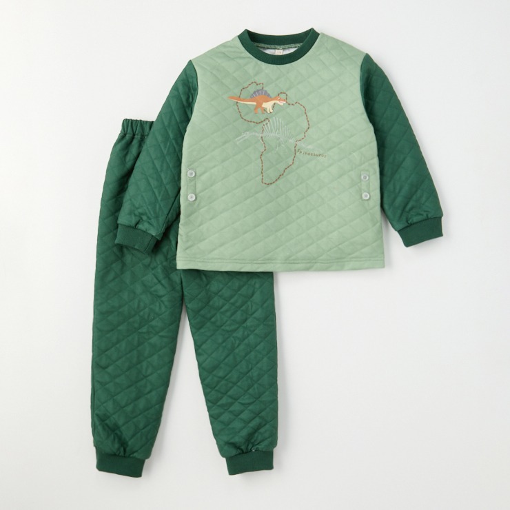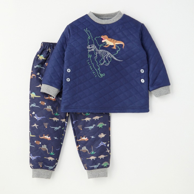 ネイビー色はティラノサウルス柄。モスグリーン色はスピノサウルス柄の蓄光プリントパジャマ。光ると骨が浮かび上がる(^^♪                   トップスとボトムを留めるボタン付きでお腹が出ない仕様になっています。
