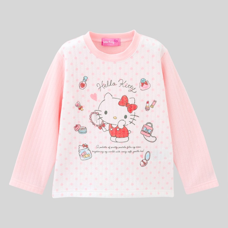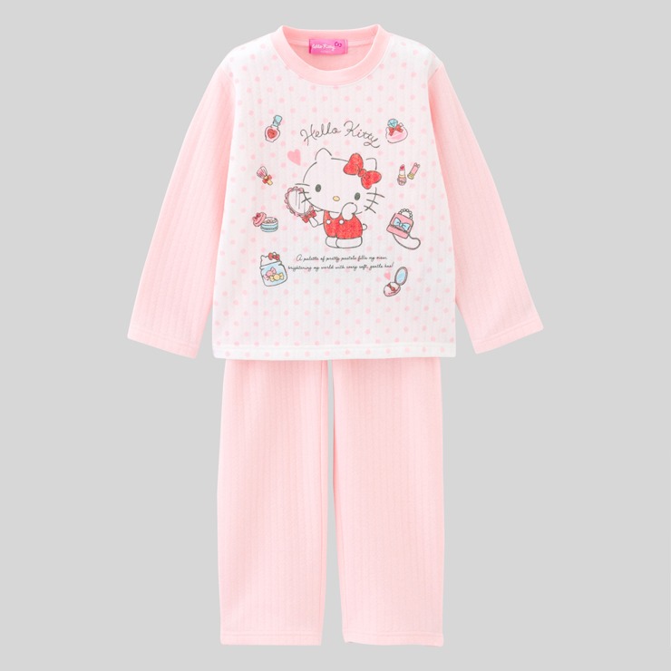 大人気 サンリオキャラクターズより ハローキティ長袖パジャマが登場。 ハローキティをプリントした上着とロングパンツの組合せパジャマです。