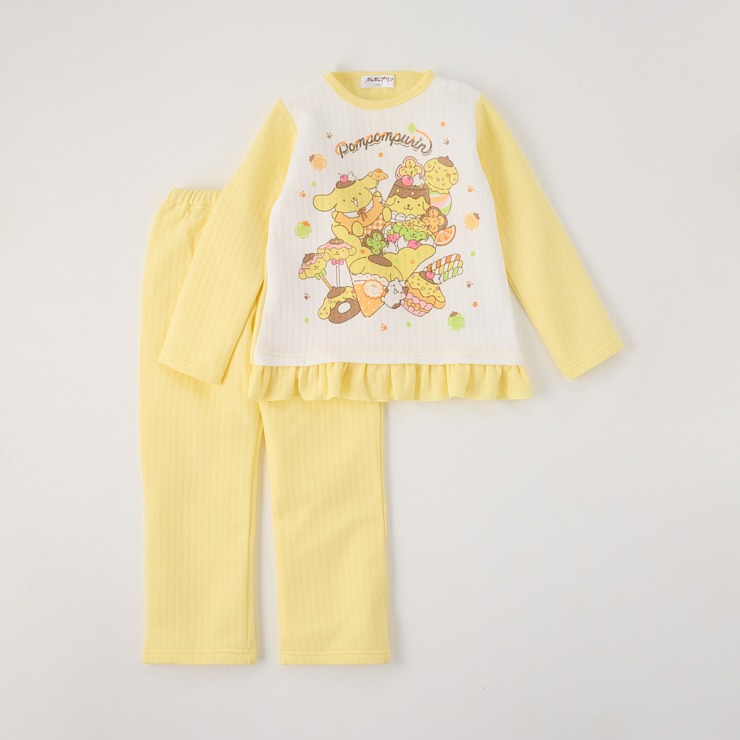 大人気 サンリオキャラクターズより ポムポムプリン長袖パジャマが登場。 ポムポムプリンをプリントに裾フリルがついた上着とロングパンツです。