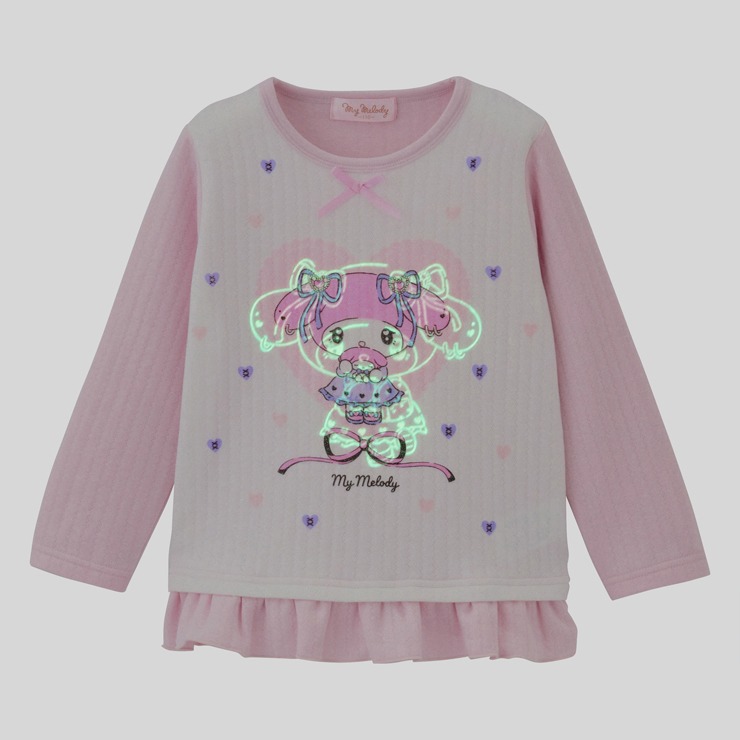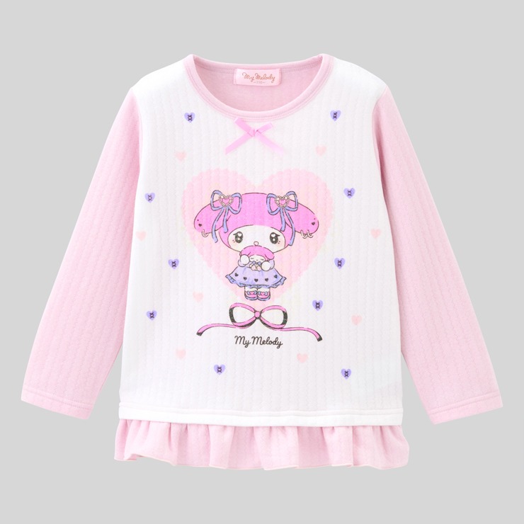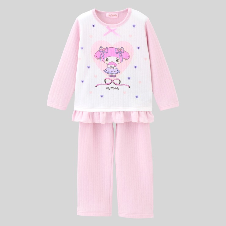 大人気 サンリオキャラクターズより マイメロディ長袖パジャマが登場。 マイメロディをプリント、裾フリルがついた上着とロングパンツです。